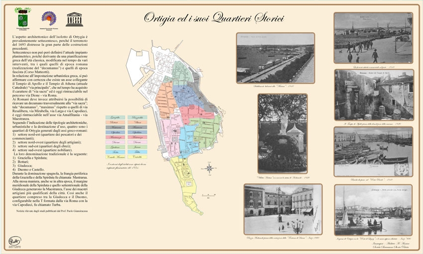 Il cartello è stato installato in Piazza Pancali ed è strutturato secondo una innovativa impostazione grafica e di contenuti. Presenta una pianta illustrata dell'isola di Ortigia costruita attraverso la descrizione degli antichi quartieri del centro storico, indicati con le denominazioni storiche e le locuzioni dialettali. La pianta è inoltre corredata da foto e mappa storiche che illustrano Ortigia nella sua evoluzione storico-temporale.